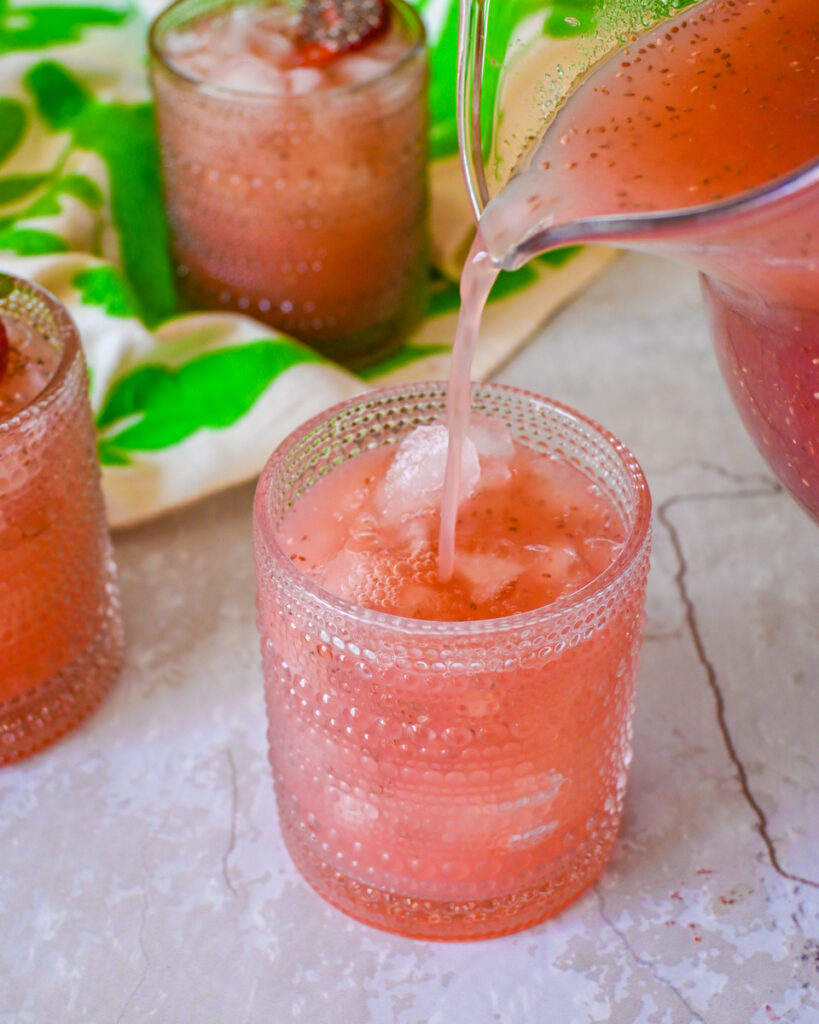 - Mix in the remaining 2 cups of water and chia seeds. Chill, and enjoy over plenty of ice. Garnish with fresh strawberries if desired.PRO TIP: While this step is not necessary, I like to let my drink sit at room temperature in the pitcher for about 30 minutes before chilling it. This gives the chia seeds time to plump up.