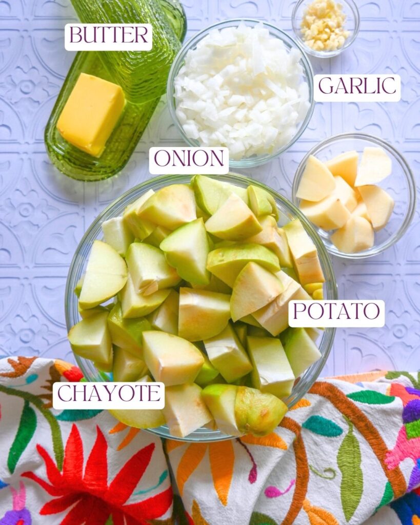 With simple ingredients and an easy-to-follow recipe, even a novice cook can make a delicious batch of sopa de chayote! All you need is: butter, olive oil, onion, garlic, chayote squash, potato (optional, but helps thicken the soup), chicken or vegetable broth, salt, and chili flakes (optional).