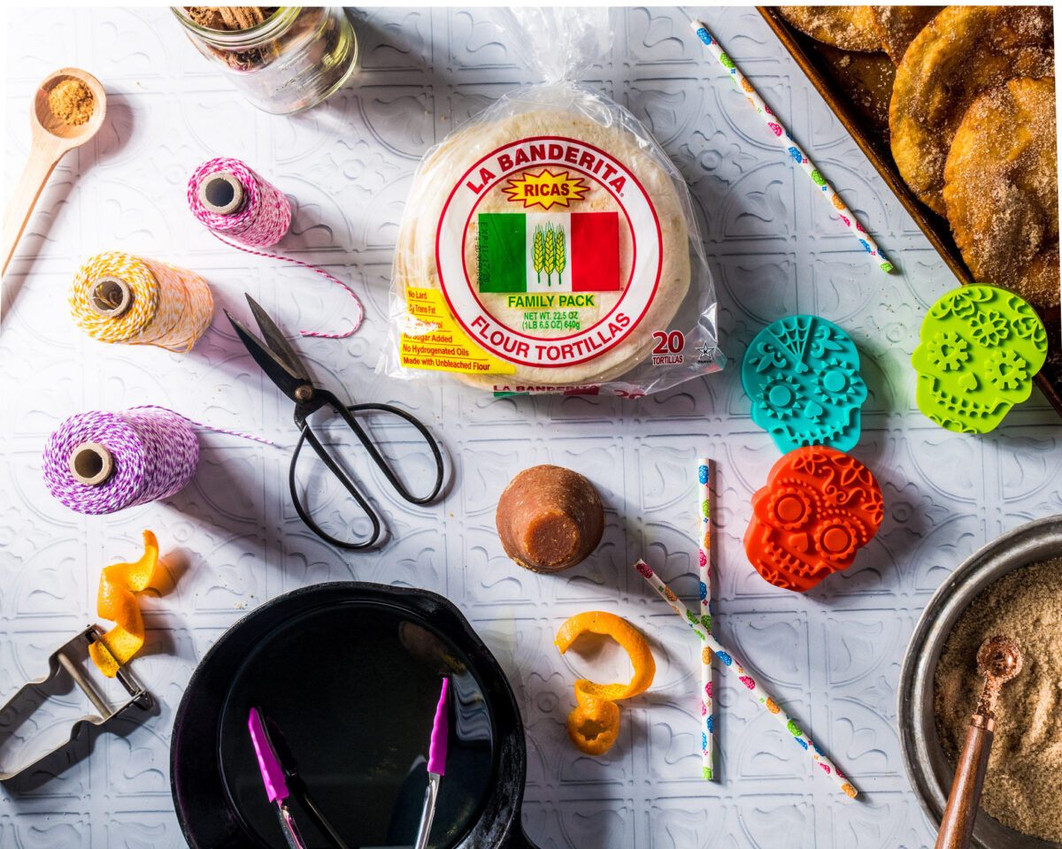 My kids love making these cute little buñuelos with tortillas for Day of the Dead. We punch holes in a few to add to our árbol de la vida and share the rest with friends and family as we share decorate our altar, play music, and reminisce about our dearly departed. The best part about this recipe, is that it can be adapted to any holiday – all you need is a festive cookie cutter. If I want my buñuelos to look a little more traditional, I’ll fry the tortillas whole.